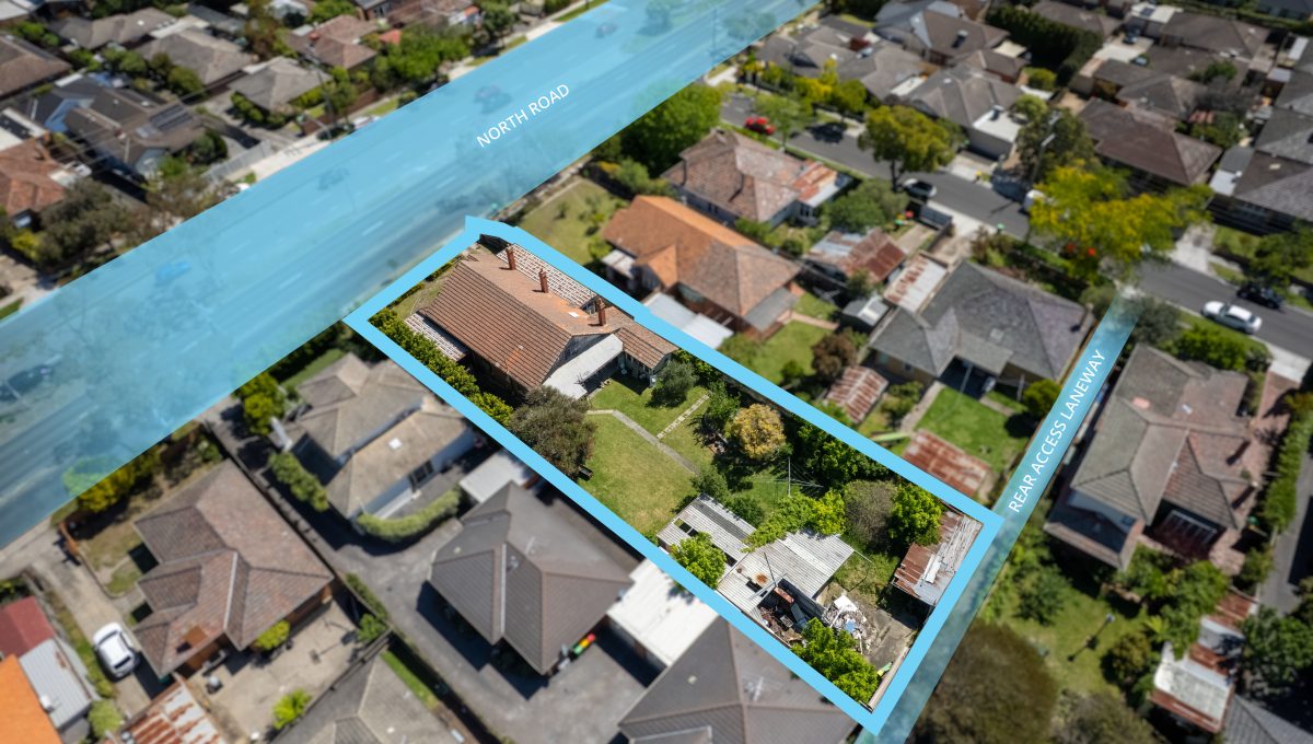 A rare 1080sqm (approx.) landholding with dual driveways and coveted rear laneway access, offering exceptional development potential.